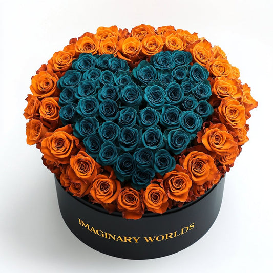 The Vivid Heart Ramo Buchon Collection from IMAGINARY WORLDS embodies elegance and heartfelt expression through each uniquely crafted rose box. Celebrate the art of floristry with this stunning collection, where each piece features a heart-shaped design composed of vividly colored roses, set against a backdrop of complementary hues. From the serenity of teal to the passion of red, each arrangement is encased in a sophisticated circular black box adorned with the golden text "IMAGINARY WORLDS," making these pieces ideal for gifting or decorating a cherished space. Perfect for anniversaries, milestones, or just because, the Vivid Heart Ramo Buchon Collection transforms floral gifting into a luxurious experience.