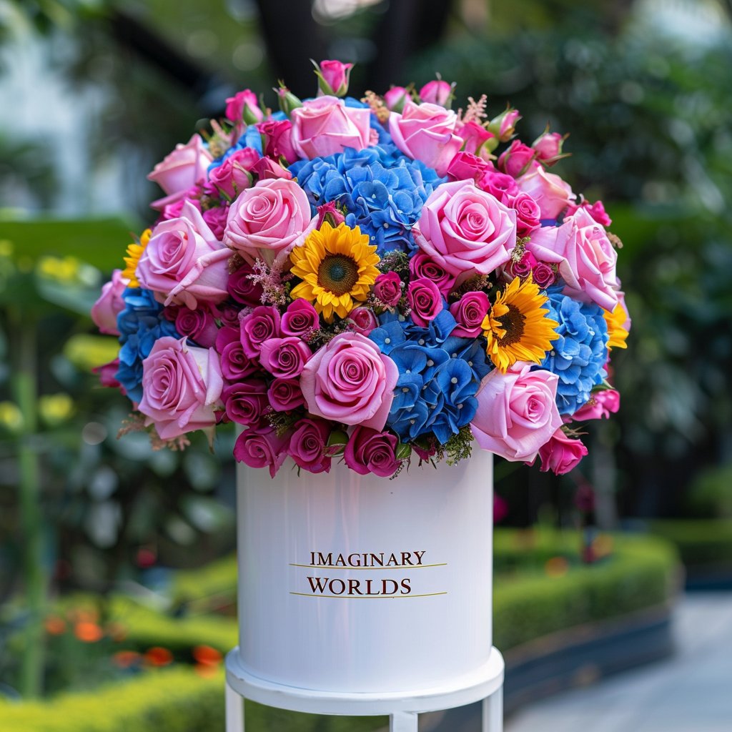 The Ramo Buchón Enchanted Oasis is a mesmerizing bouquet, showcasing preserved pink and blue roses with sunflowers. This exquisite arrangement, nestled in an elegant white round box, symbolizes beauty, joy, and tranquility. Perfect as an everlasting gift or as a centerpiece that will continually captivate and charm.