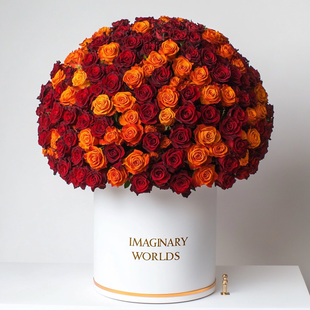 Immerse yourself in the vibrant allure of the Ramo Buchón Radiant Sunset. This opulent arrangement is offered in six grand sizes: 16, 30, 50, 75, 100, and over 300 splendid roses in shades of red and orange, each meticulously preserved to showcase their breathtaking beauty and elegance. Housed in an exquisite red velvet round hat box, this bouquet stands as a symbol of fiery passion and undying affection. It's the quintessential expression for any celebratory moment, be it a landmark anniversary, a thoughtful gift, or simply to enrich your environment with a burst of color.