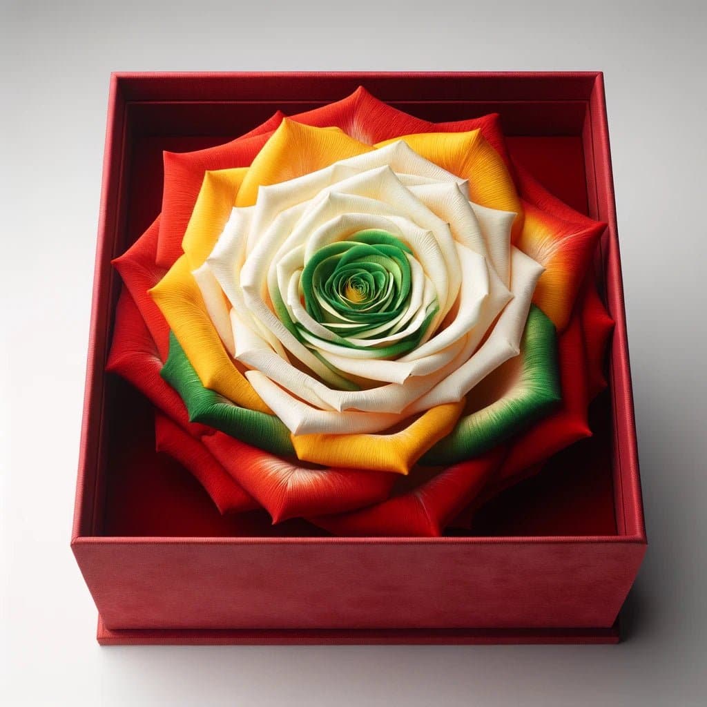 Opulent Presentation: The rich red velvet box adds a touch of luxury to your gift, creating a memorable presentation. Vibrant Quartet of Roses: Featuring roses in yellow, orange, white, and green, symbolizing warmth and vitality. Timeless Elegance: Express your sentiments with a gift that embodies timeless beauty and positivity. Perfect for Any Occasion: Whether it's a gesture of celebration or a token of encouragement, this gift box is sure to brighten their day.