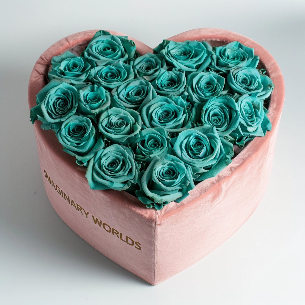 The "Teal Roses in Light Pink Heart-Shaped Velvet Box" is a captivating arrangement of preserved teal roses, each bloom meticulously placed to create a lavish display of affection. Teal roses symbolize uniqueness and creativity, making them a perfect choice for expressing deep emotions. The light pink velvet heart-shaped box represents tenderness, elegance, and timeless beauty, enhancing the romantic gesture.